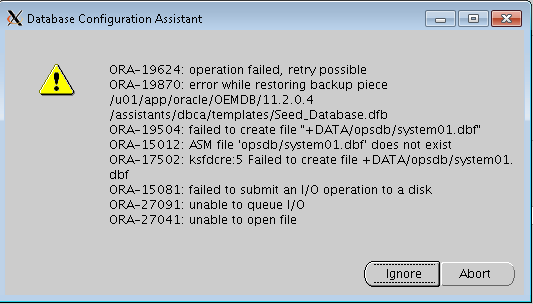 Today while creating database on ASM using DBCA I got following error exactly after reaching 4%.