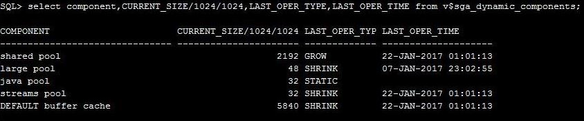 If you see above output, due to sudden growth in shared pool size, other components like large pool, db cache & streams pool have shrunk.