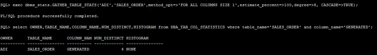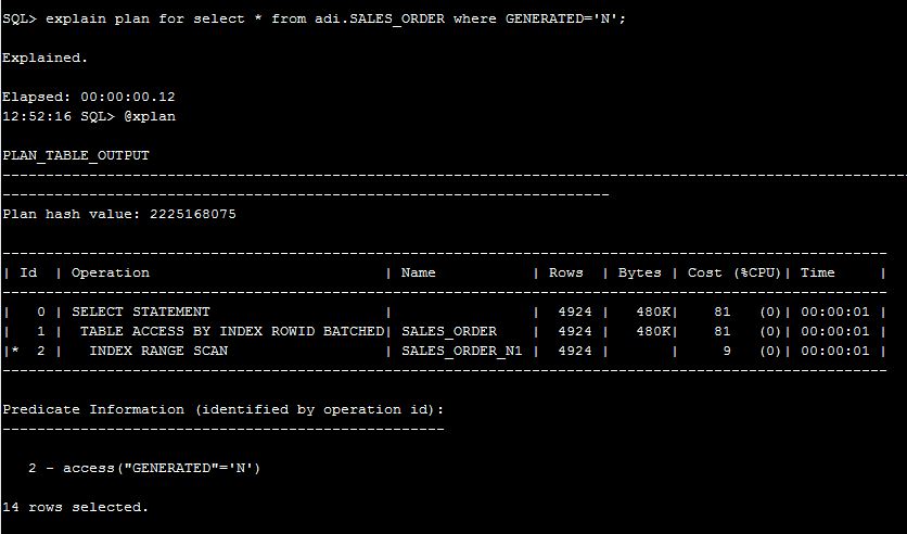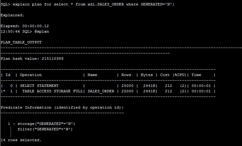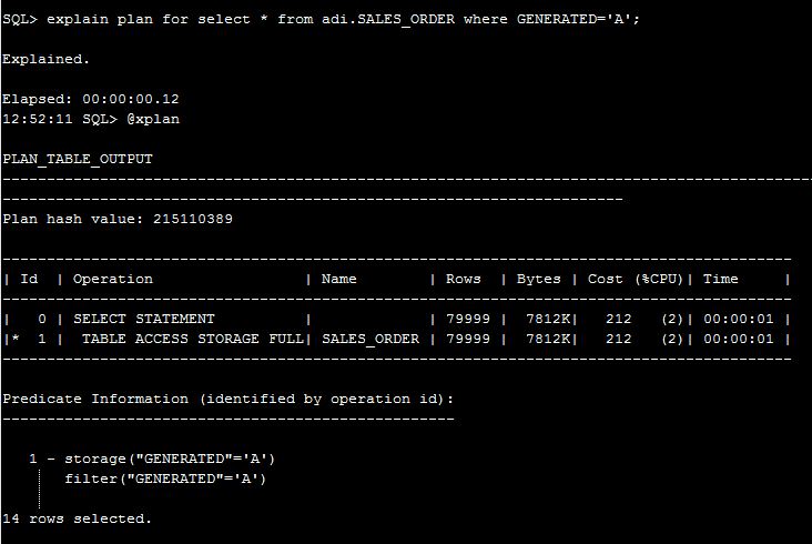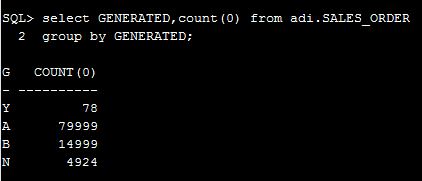 I have a table ADI.SALES_ORDER with 100000 rows with index SALES_ORDER_N1 on column GENERATED.
