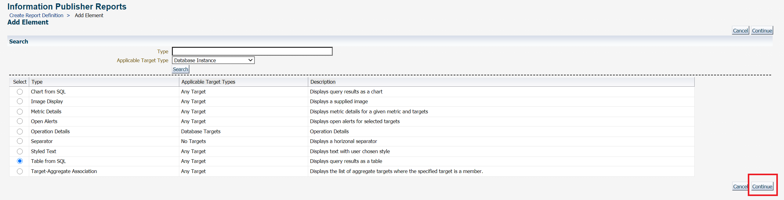 7. As I need to run a query against repository database, I will select “Table from SQL” & click on “continue”.