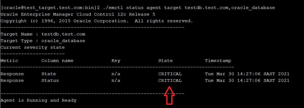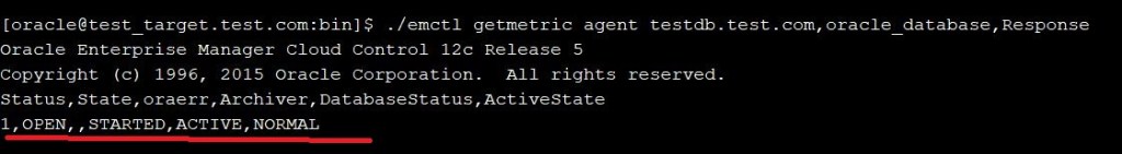 emctl getmetric agent testdb.test.com,oracle_database,Response