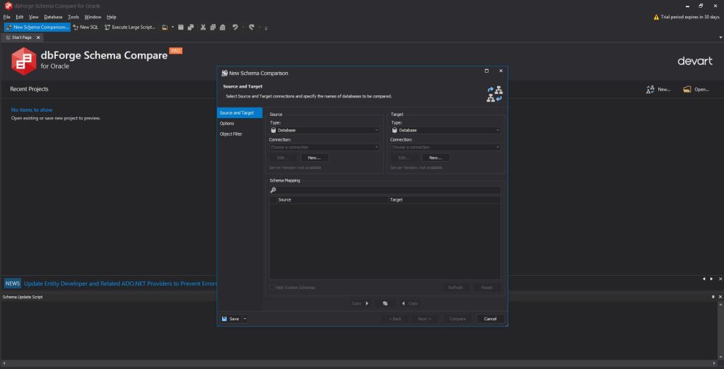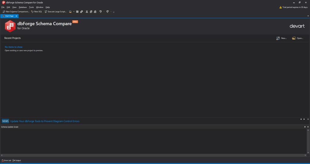 This section will cover identifying & applying structural changes in two schemas. Start application named “dbForge Schema Compare for Oracle”.