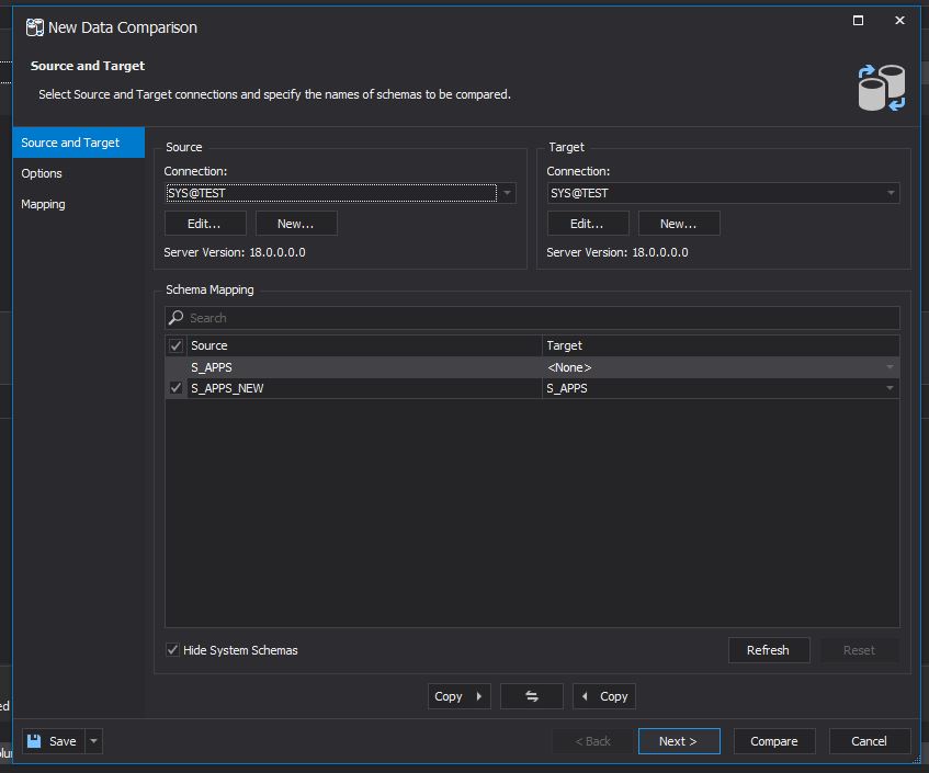 Click on New Data Comparison. Specify Source & target schema correctly as given below. I am comparing S_APPS_NEW with S_APPS & Click on compare button: