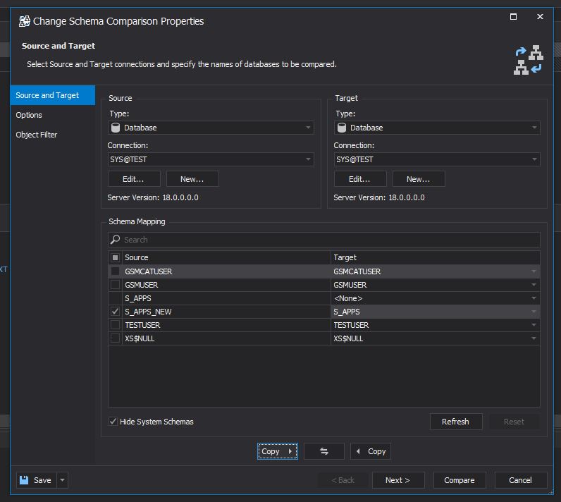 Specify Source & target schema correctly as given below. I am comparing S_APPS_NEW with S_APPS & Click on compare button: