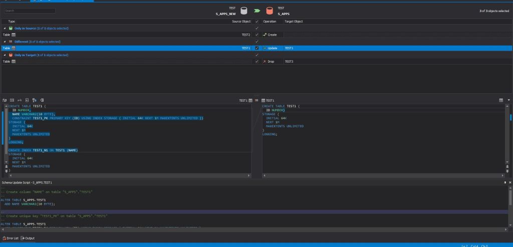 Now below screen shows schema comparison report. Like object only present in S_APPS_NEW that’s needs to be created. Different object between two schema that needs alteration & Additional object present in target which needs to be dropped: