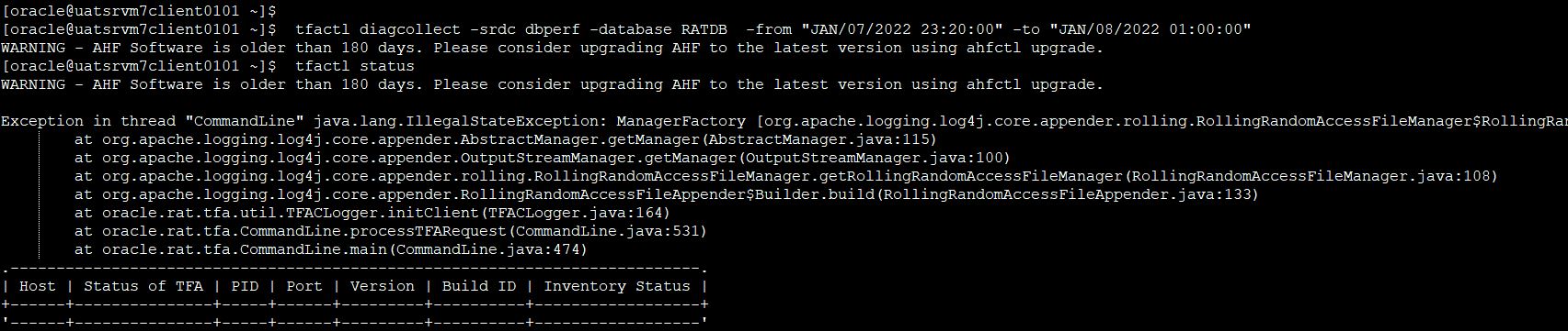 Exception in thread “CommandLine” java.lang.IllegalStateException: ManagerFactory [org.apache.logging.log4j.core.appender.rolling.RollingRandomAccessFileManager$RollingRandomAccessFileManagerFactory@5c5eefef] unable to create manager for [/grid_19c/app/grid/oracle.ahf/data/uatsrvm7client0101/diag/tfa/tfactl/user_oracle/tfa_client.trc] with data [org.apache.logging.log4j.core.appender.rolling.RollingRandomAccessFileManager$FactoryData@16293aa2]