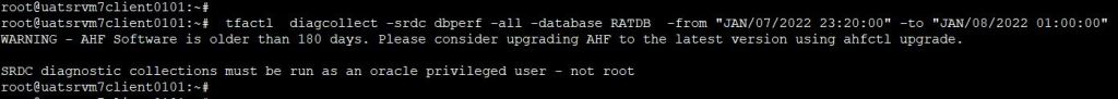 tfactl diagcollect -srdc dbperf -all -database RATDB -from “JAN/07/2022 23:20:00” -to “JAN/08/2022 01:00:00”