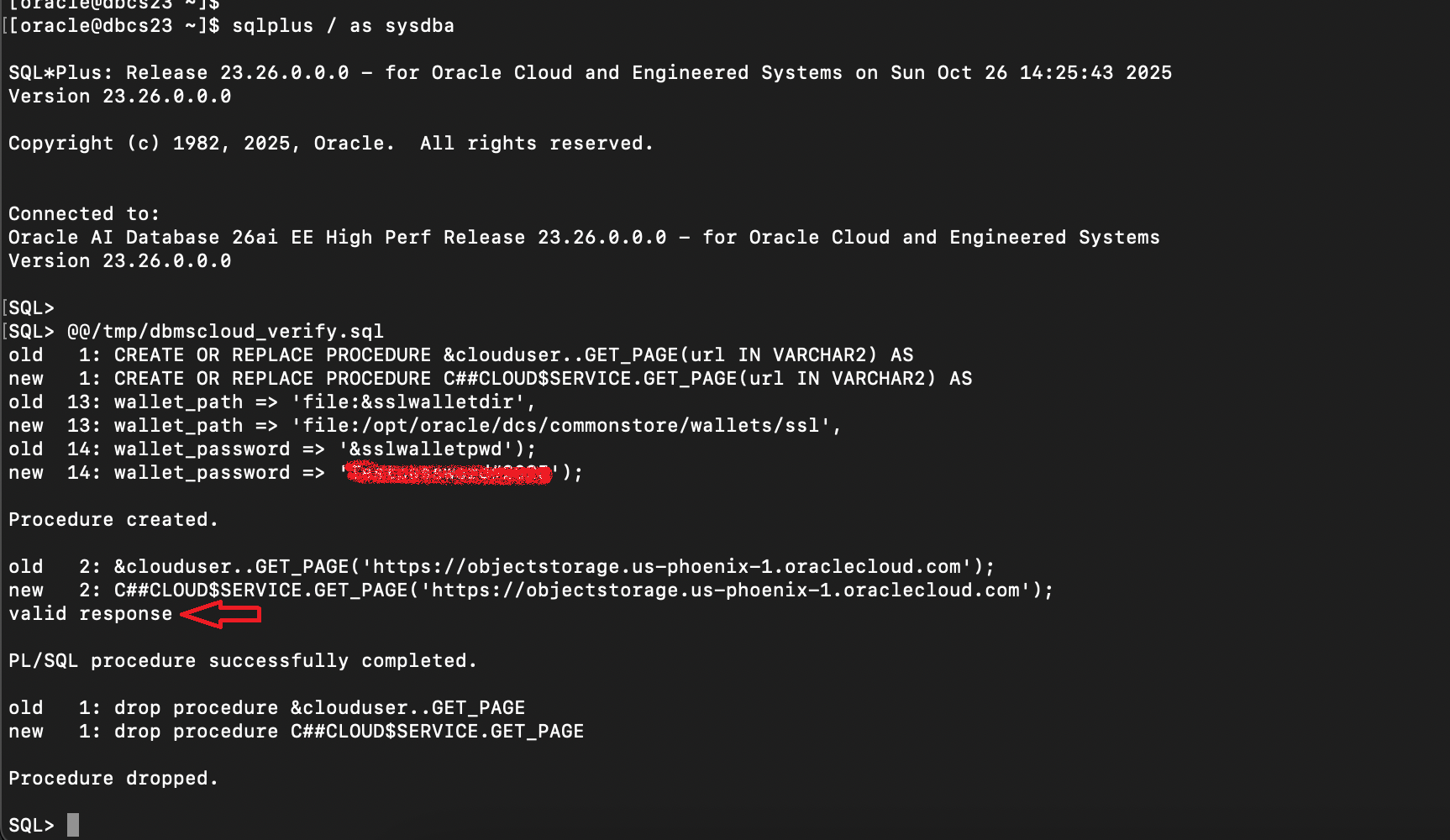 If you have properly configured the SSL wallet and set up your database environment, the script will return “valid response” when you can successfully reach out to Oracle Object Store.