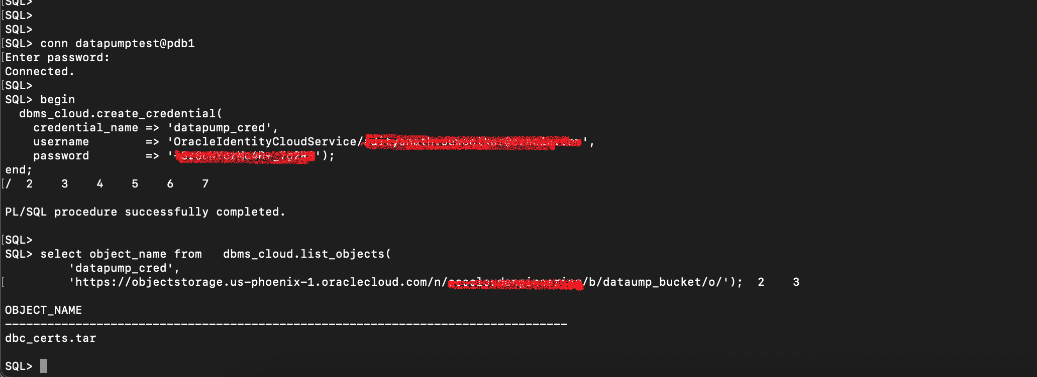 I have already created schema named DATAPUMPTEST for testing EXPDP backups. Now lets grant necessary privileges to use DBMS_CLOUD: