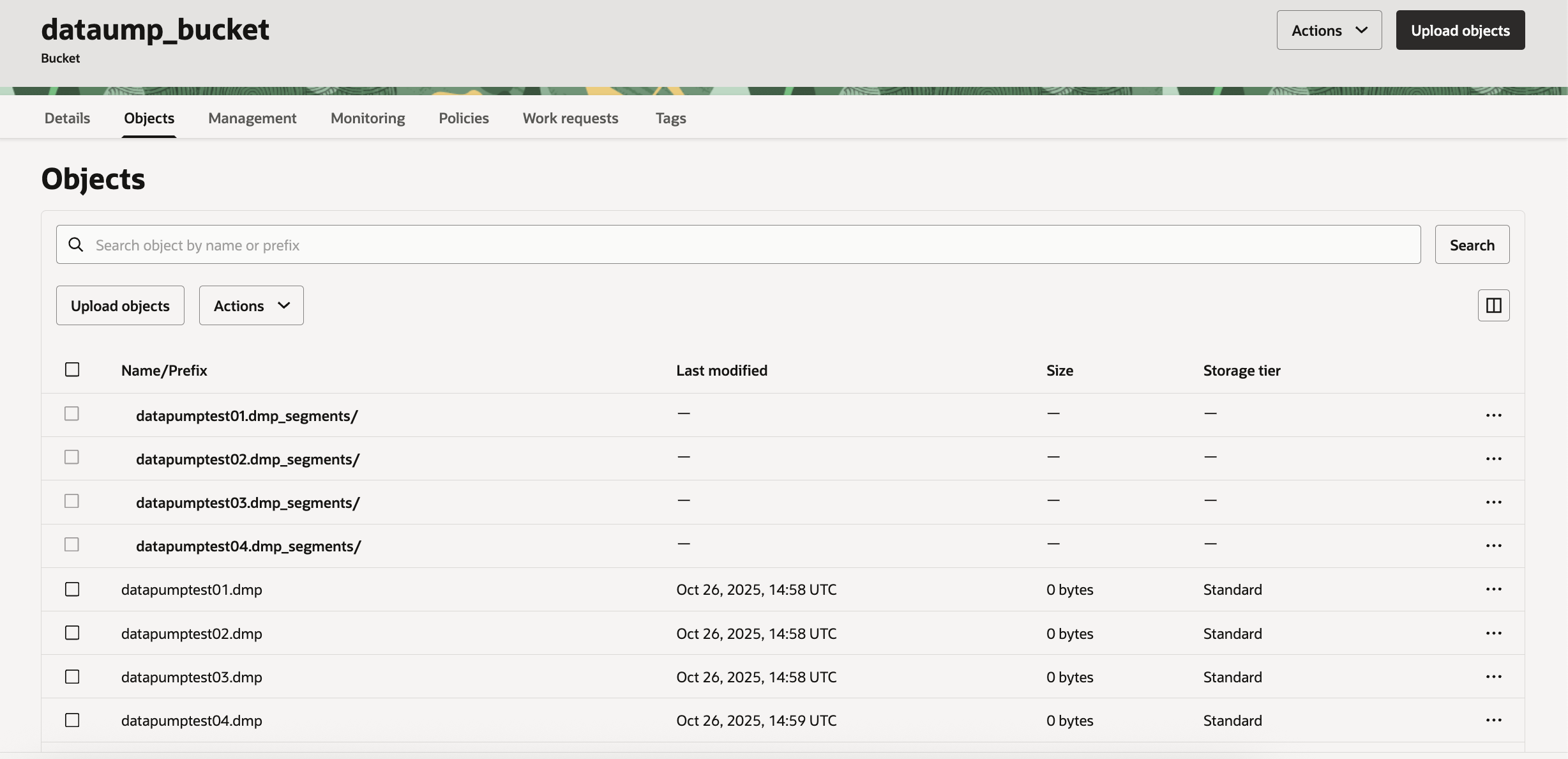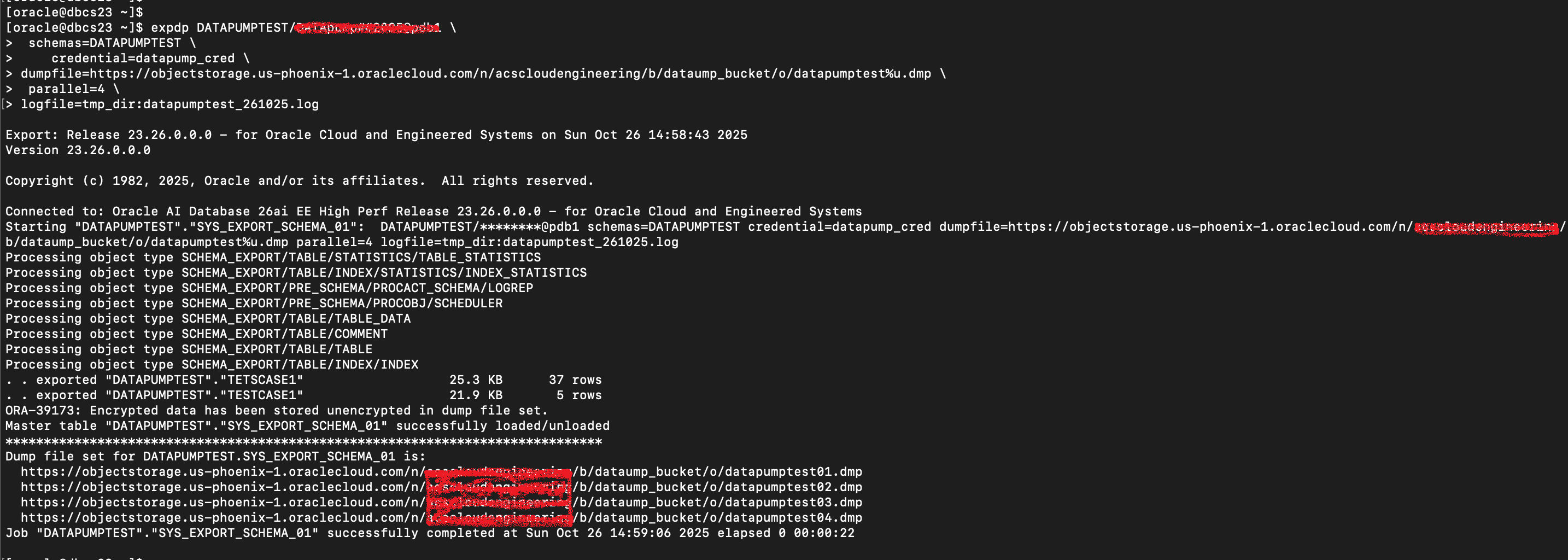 dumpfile=https://acscloudengineering.objectstorage.{region name}.oraclecloud.com/n/{namespace}/b/{bucket name}/o/datapumptest%u.dmp \