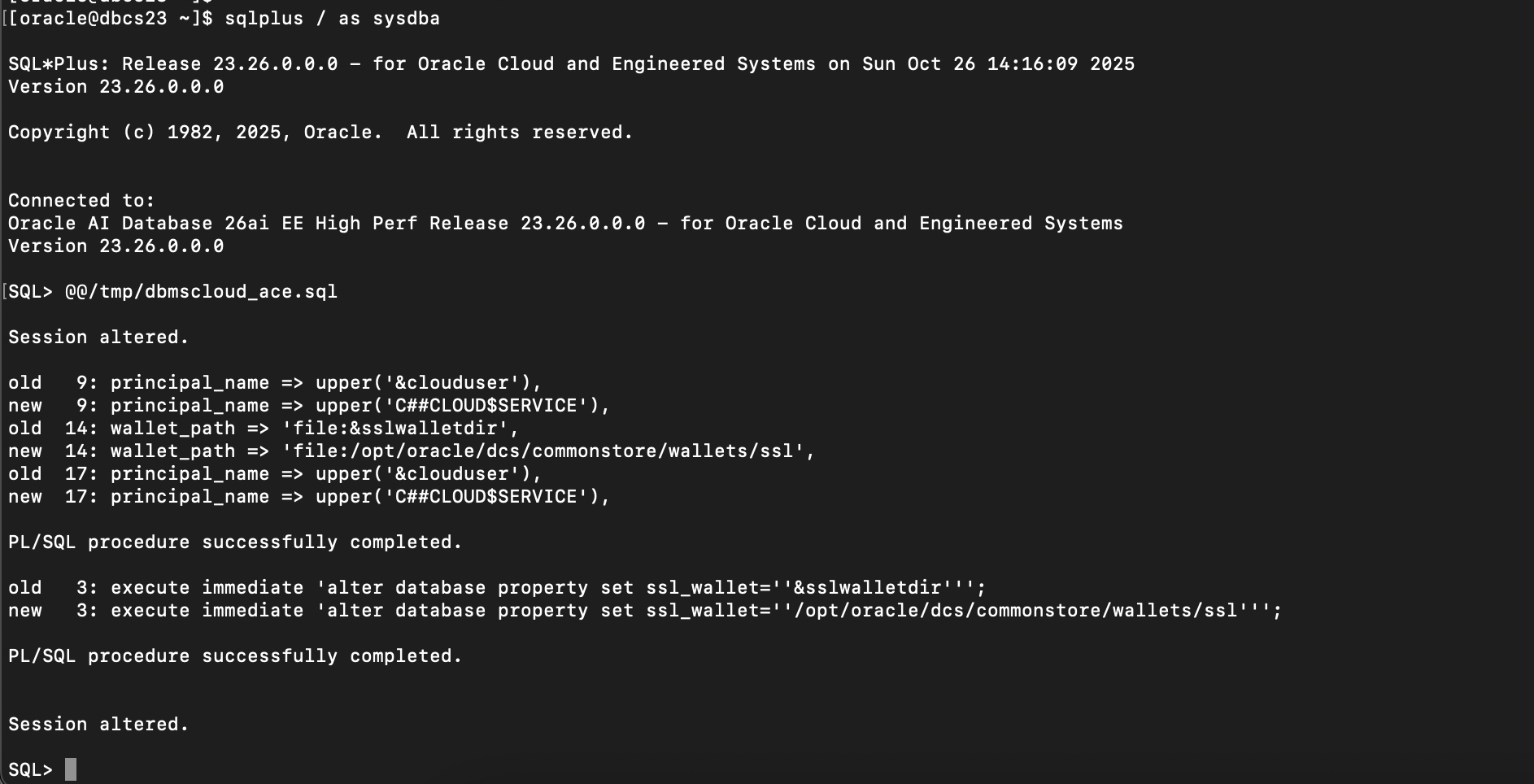 Create a file called “/tmp/dbmscloud_ace.sql” with the following contents. Edit the sslwalletdir setting if you have altered the location.