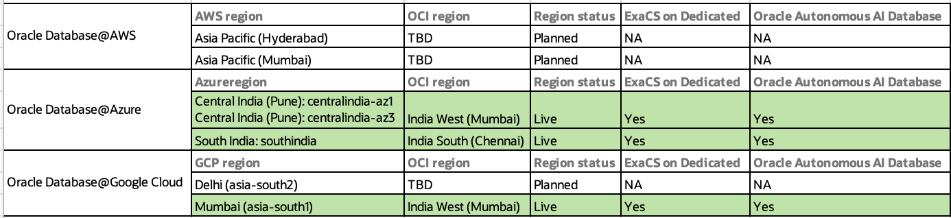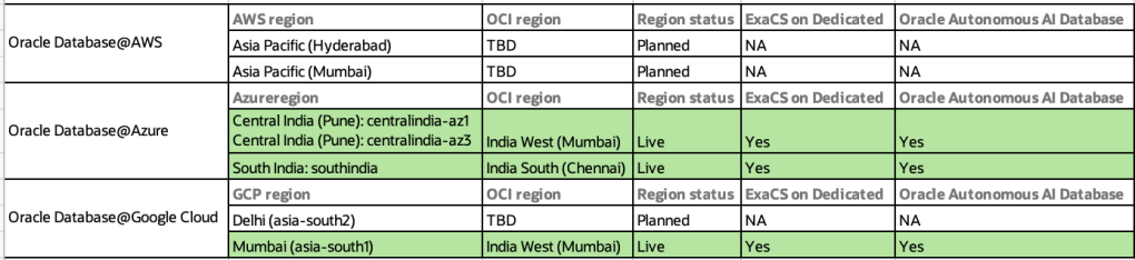 Other services like “ExaCS on Exascale”, “Oracle Base Database Service”, “Oracle ARS” & “Oracle GG” are not available in any Indian regions as of today.