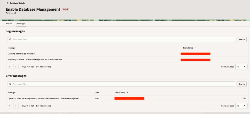 In the Messages section, I saw that the operation failed with the error: “Operation failed because password secret is not accessible by Database Management.”