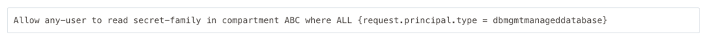 Allow any-user to read secret-family in compartment DBCOMPARTMENT where ALL {request.principal.type = 'dbmgmtmanageddatabase'}