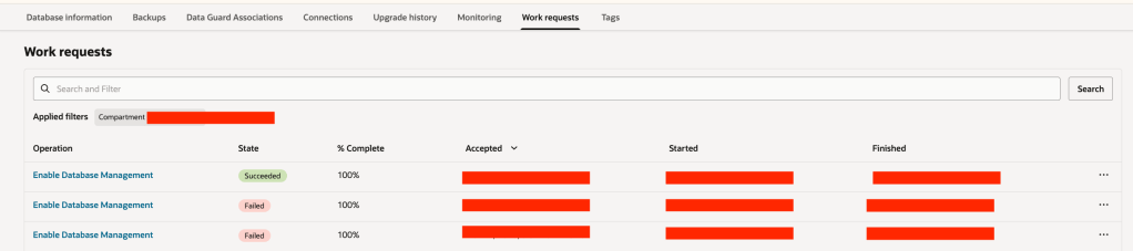 To investigate further, I reviewed the “Work Requests” tab for the database target and found that the “Enable Database Management” operation was in a failed state.