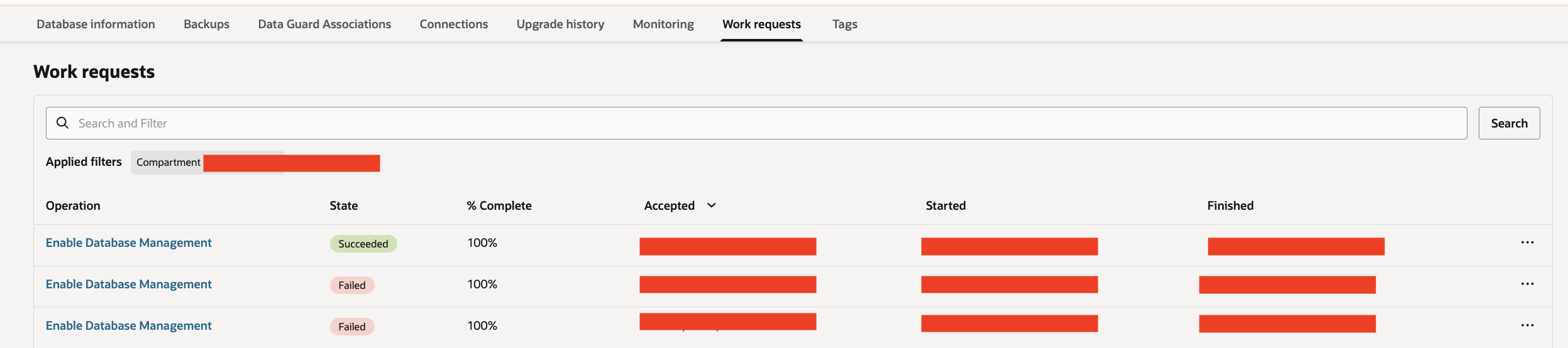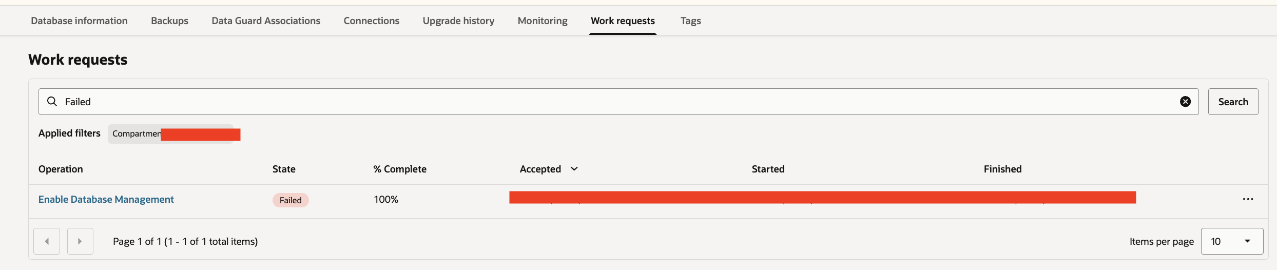 To investigate further, I reviewed the “Work Requests” tab for the database target and found that the “Enable Database Management” operation was in a failed state.