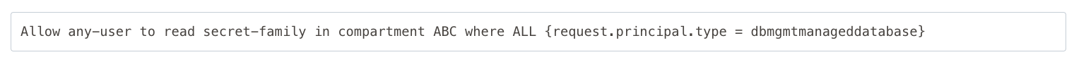 Allow any-user to read secret-family in compartment DBCOMPARTMENT where ALL {request.principal.type = 'dbmgmtmanageddatabase'}